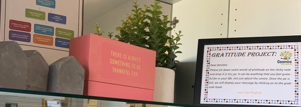 Coombs Early Learning is fortunate to be part of the “Playing with Gratitude” action research project. The project aim believes the best early start in life will result in a future of achievable possibilities. We know these possibilities have their foundations with a child’s right to play and the transformational learning experienced through co-play.